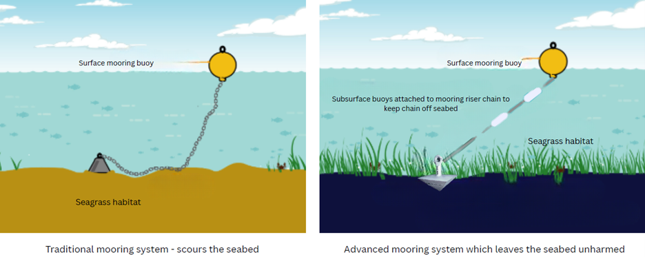 Nantucket Land & Water Council, which advocates for the integrity of Nantucket’s natural land and water resources, received a grant to fully fund an alternative mooring system which eliminates bottom scouring and allows eelgrass meadows to flourish (see illustration below).