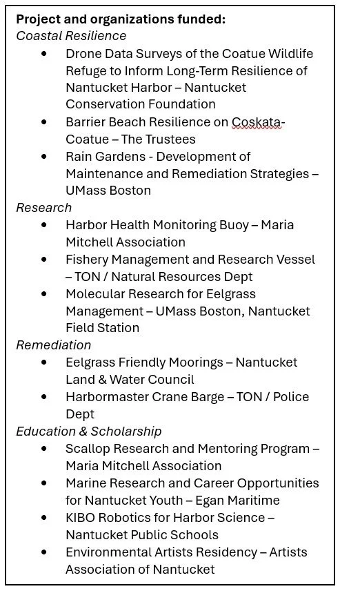 The Foundation also pledged a matching grant to the town's Natural Resources Department and Harbormaster for two much-needed new vessels. In addition, Artists Association of Nantucket has received a grant for an Environmental Artists Residency, Egan Maritime received funding for marine research experiences for Nantucket Public School students